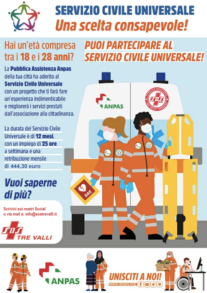 La Pubblica Assistenza Anpas della tua città ha aderito al Servizio Civile Universale con un progetto che ti farà fare un'esperienza indimenticabile e migliorerà i servizi prestati dall'associazione alla cittadinanza.
